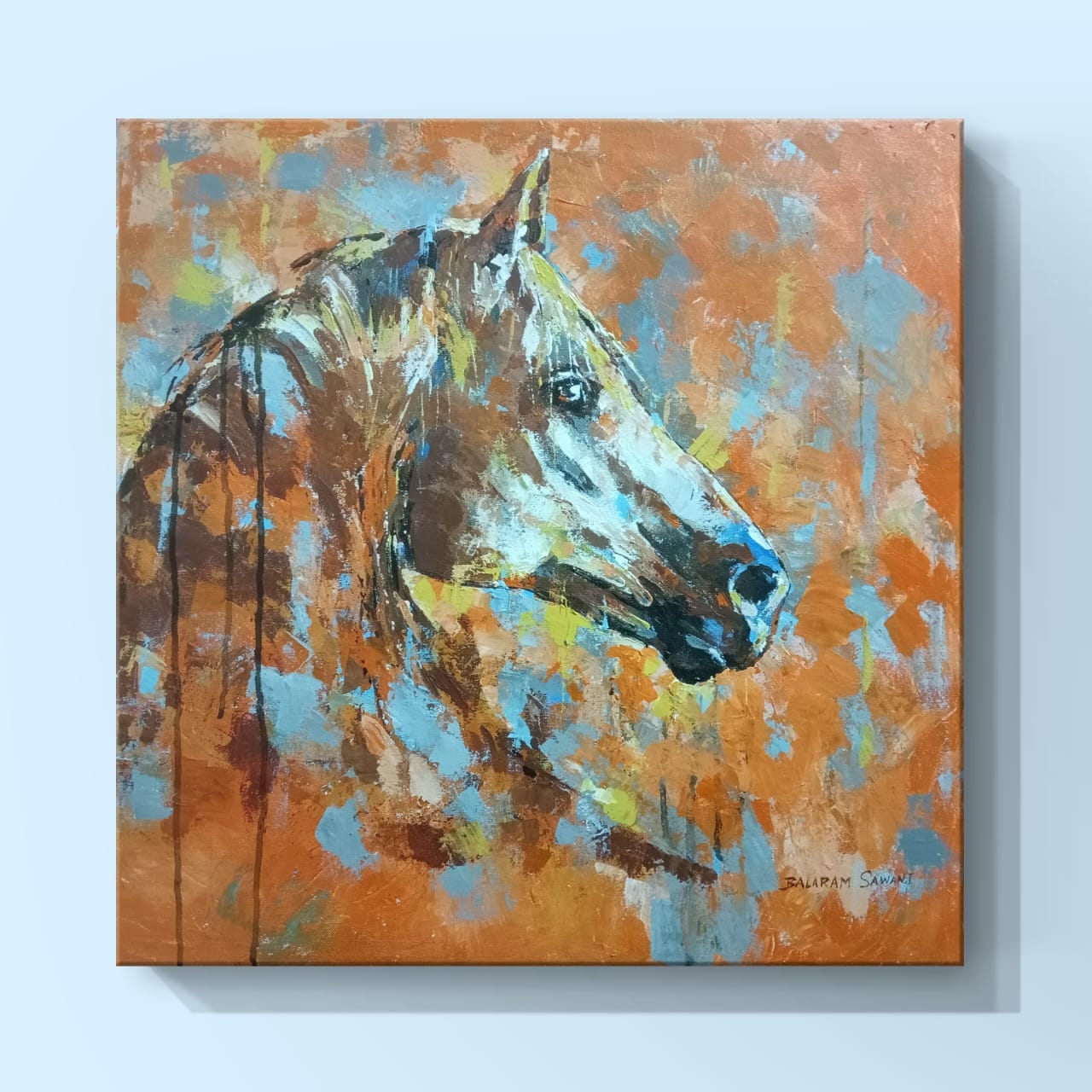 This painting shows a close-up of a horse’s head, created with expressive, textured brushstrokes. The horse is painted in rich browns with highlights of blue and white. The background is filled with warm yellows, oranges, and hints of green, giving a glowing, autumn-like atmosphere. Dripping paint details add a modern, artistic touch.