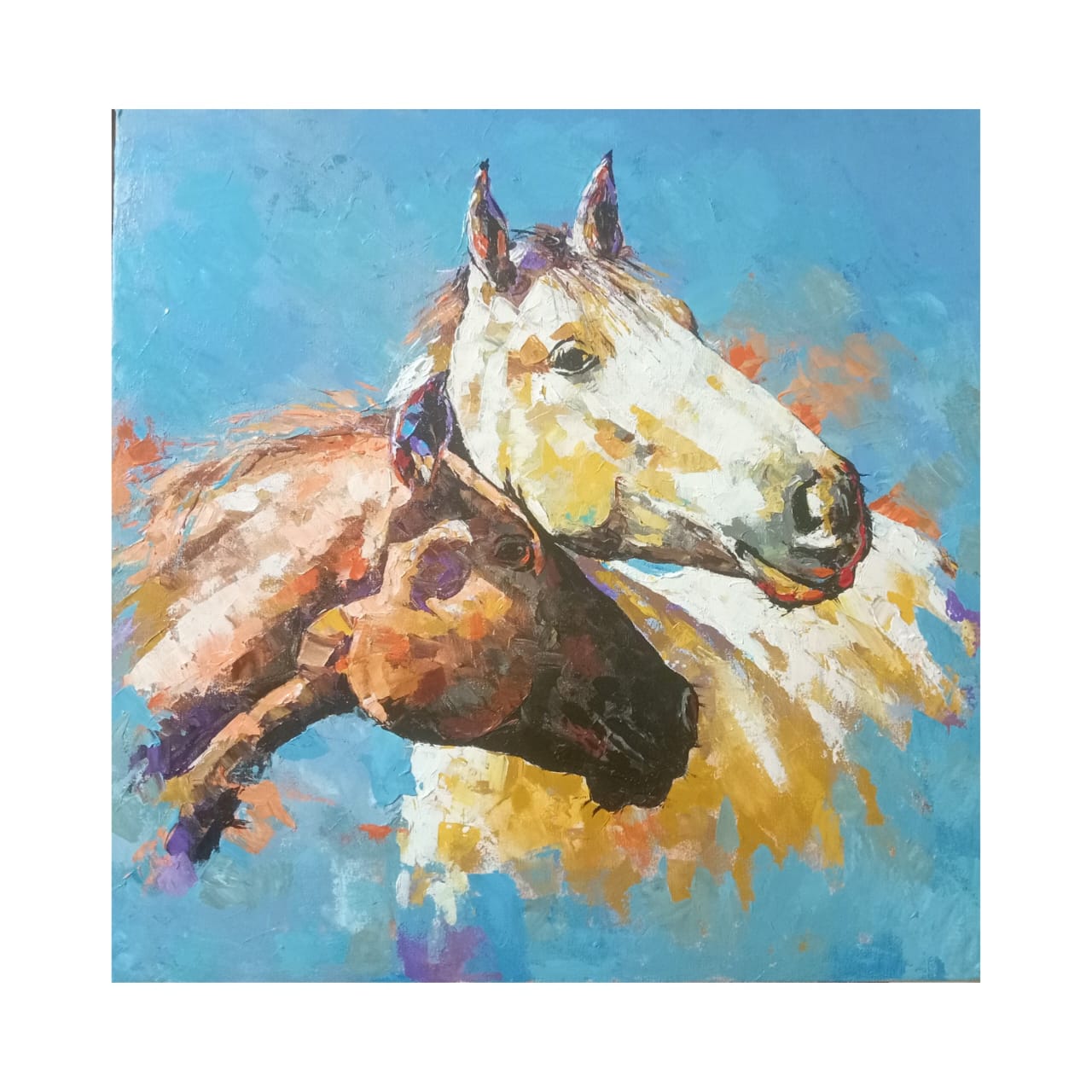 This is a colourful painting of two horses set against a bright blue background. The artwork uses bold, textured brushstrokes in shades of yellow, brown, orange, and white, creating a dynamic and energetic look. The overlapping composition adds depth, while the expressive use of colour gives the painting a modern and lively feel.